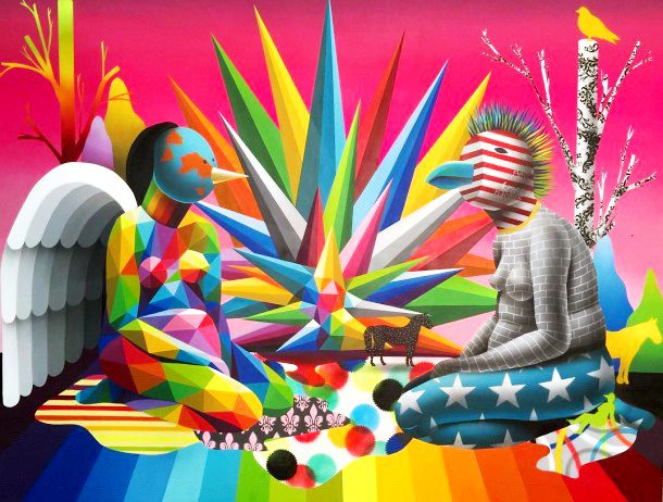 Caractérisé de pop-surréaliste, le style d’Okuda n’en reste pas moins empreint d’une forte essence urbaine. Du Mali au Japon en passant par le Chili et la Russie, ses chefs d’oeuvre géométriques colorent les rues du monde entier. Des oeuvres qui regorgent de vitalité et qui se caractérisent par la multitude de contradictions qu’il parvient à entremêler dans ses créations comme le mélange de monochrome et l’éclatement de couleurs ou encore l’homme et l’animal.